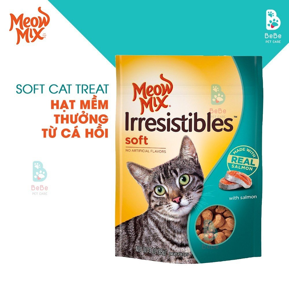 Bạn có thể gần gũi hơn với boss mèo của mình bất cứ lúc nào với một món ăn ngon! Meow Mix Irresistibles được làm bằng cá hồi thật thơm ngon và không có hương vị nhân tạo. Mỗi hạt treat có kết cấu mềm, dễ nhai giúp kích thích vị giác của cả những bé mèo khó tính nhất.- Được làm bằng thịt thật và không có hương vị nhân tạo- Chỉ 2 Calo mỗi hạt, giúp bổ sung như 1 món snack ngon miệng mỗi giờ chơi hàng ngày- Túi có thể khóa lại dễ dàng giúp điều trị luôn tươi mớiHãy lắc túi để thu hút sự chú ý của mèo và quan sát mèo chạy về phía bạn với sự phấn khích, sẵn sàng cho phần thưởng tiếp theo!Gợi ý cho ăn: có thể cho các boss ăn 10 – 12 viên bánh hàng ngày như một bữa ăn nhẹ.