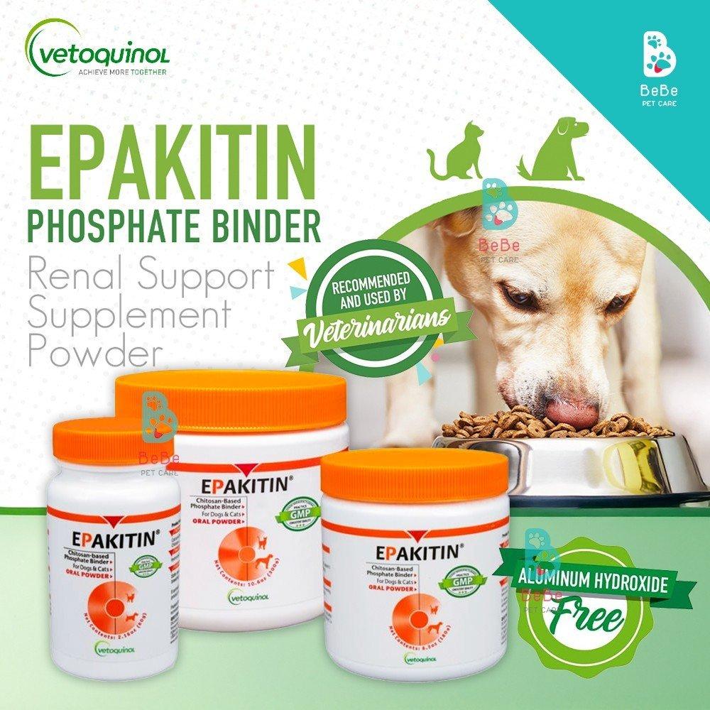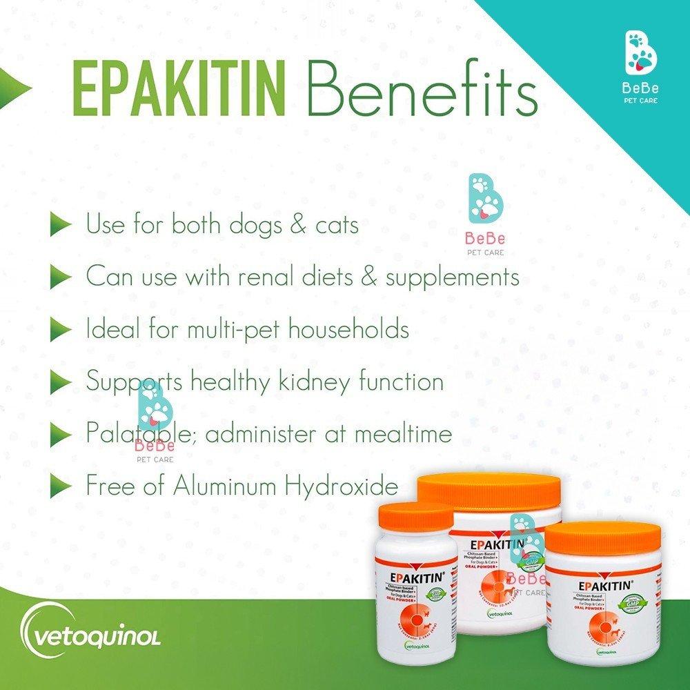 - Thành phần của epakitin, chitosan, là một polysaccharid tự nhiên có nguồn gốc từ vỏ tôm, cua. Thành phần này liên kết phốt pho một cách tự nhiên, hạn chế sự hấp thụ phốt pho từ ruột - giúp hỗ trợ chó mèo gặp các vấn đề về thận mãn tính bằng cách làm chậm các tiến trình gây hại. Hiệu quả như một chất kết dính phốt phát, làm giảm nồng độ phốt pho trong huyết thanh và đã được chứng minh là làm giảm nồng độ urê và creatinine.