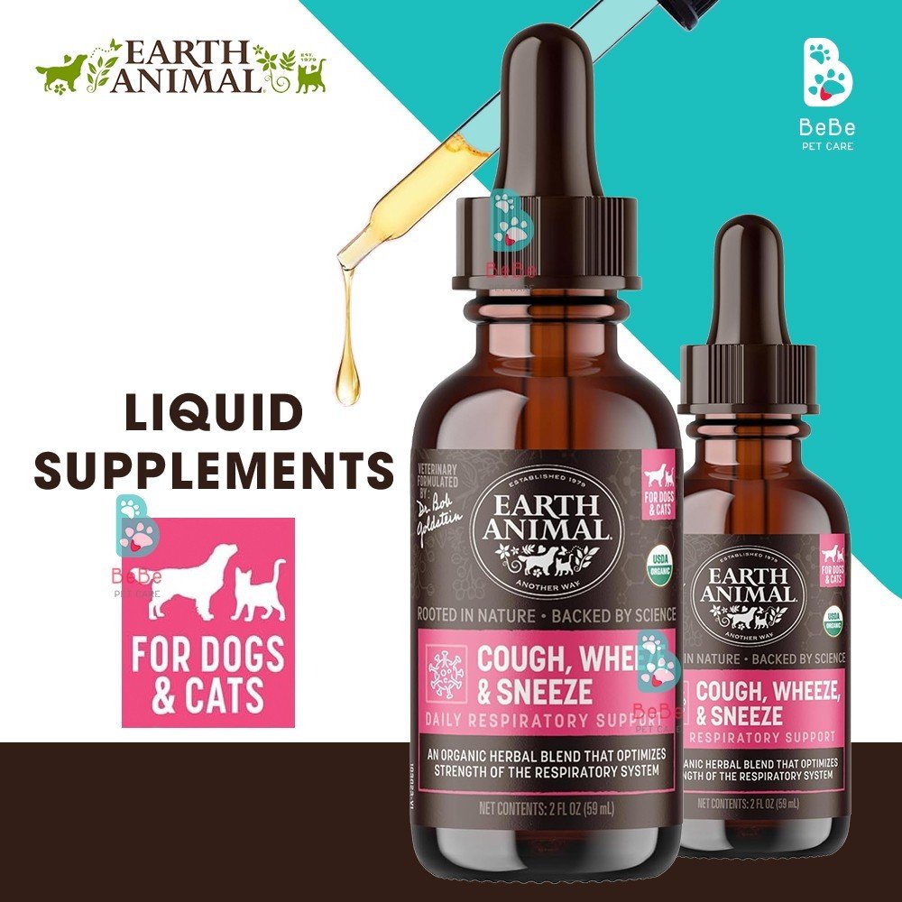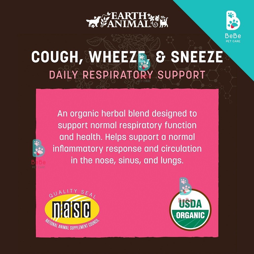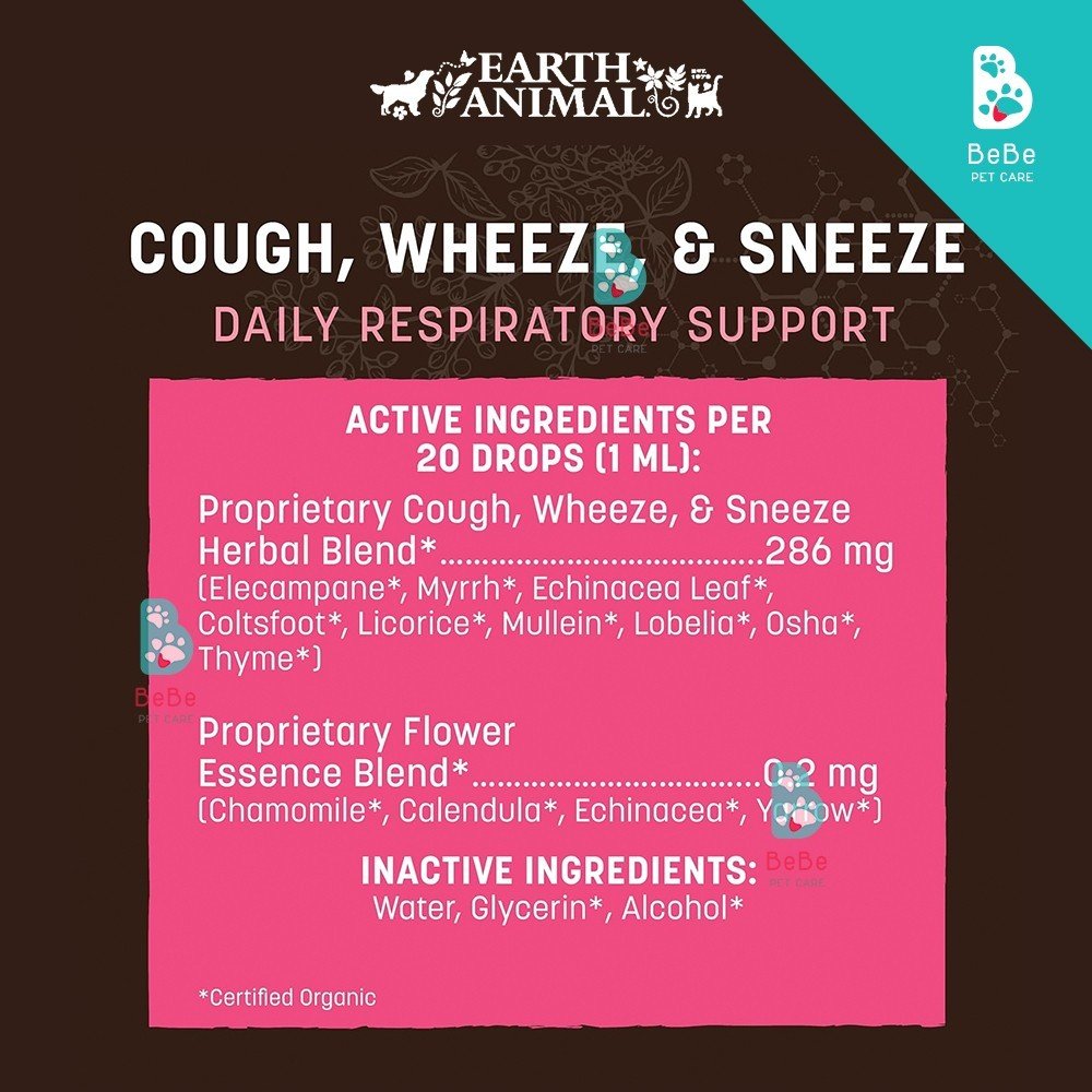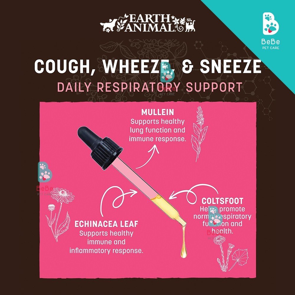 Earth Animal Cough, Wheeze & Sneeze là chất bổ sung dạng lỏng, được bào chế để hỗ trợ hệ hô hấp khỏe mạnh cho chó và mèo. Với công thức hoàn toàn từ thảo mộc tự nhiên lành tính như mullein, coltsfoot, lá và rễ echinacea, elecampane, usnea, lobelia, nhựa thơm, cam thảo và osha, sản phẩm giúp hỗ trợ thú cưng của bạn những lúc khó chịu về hô hấp.