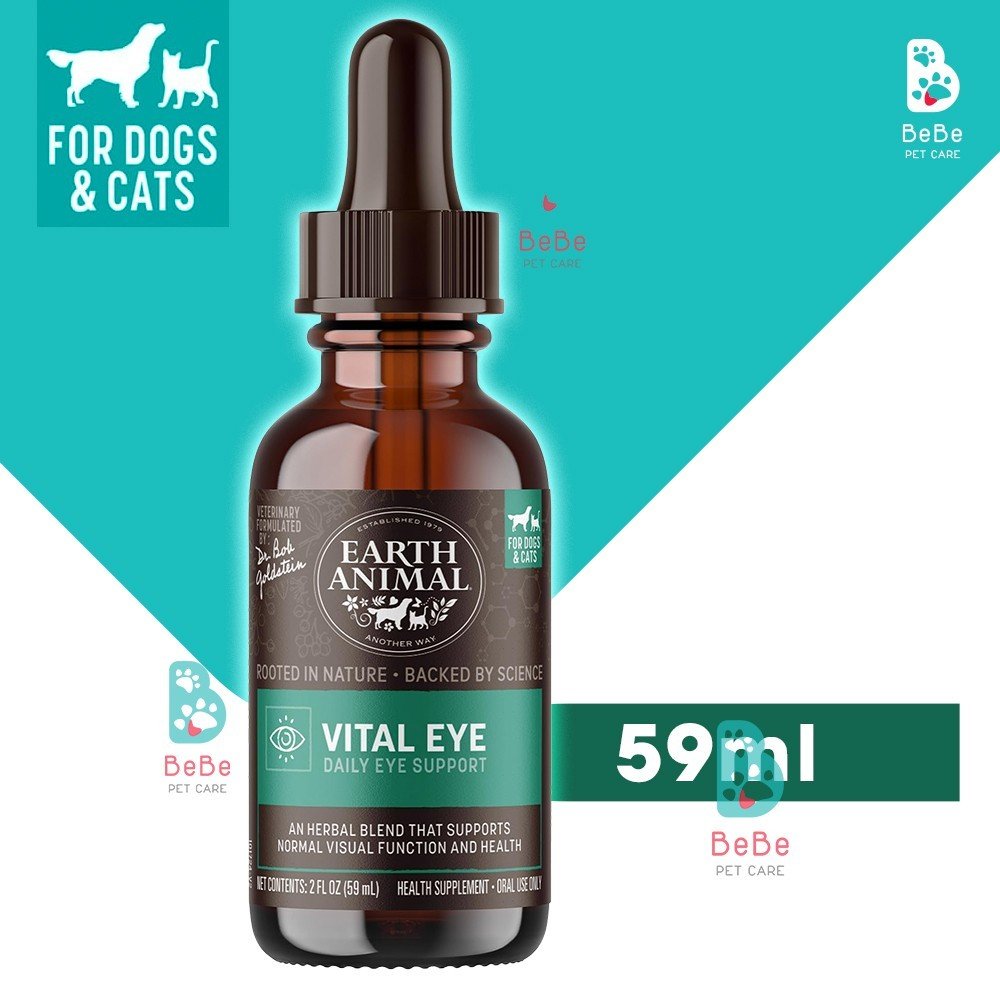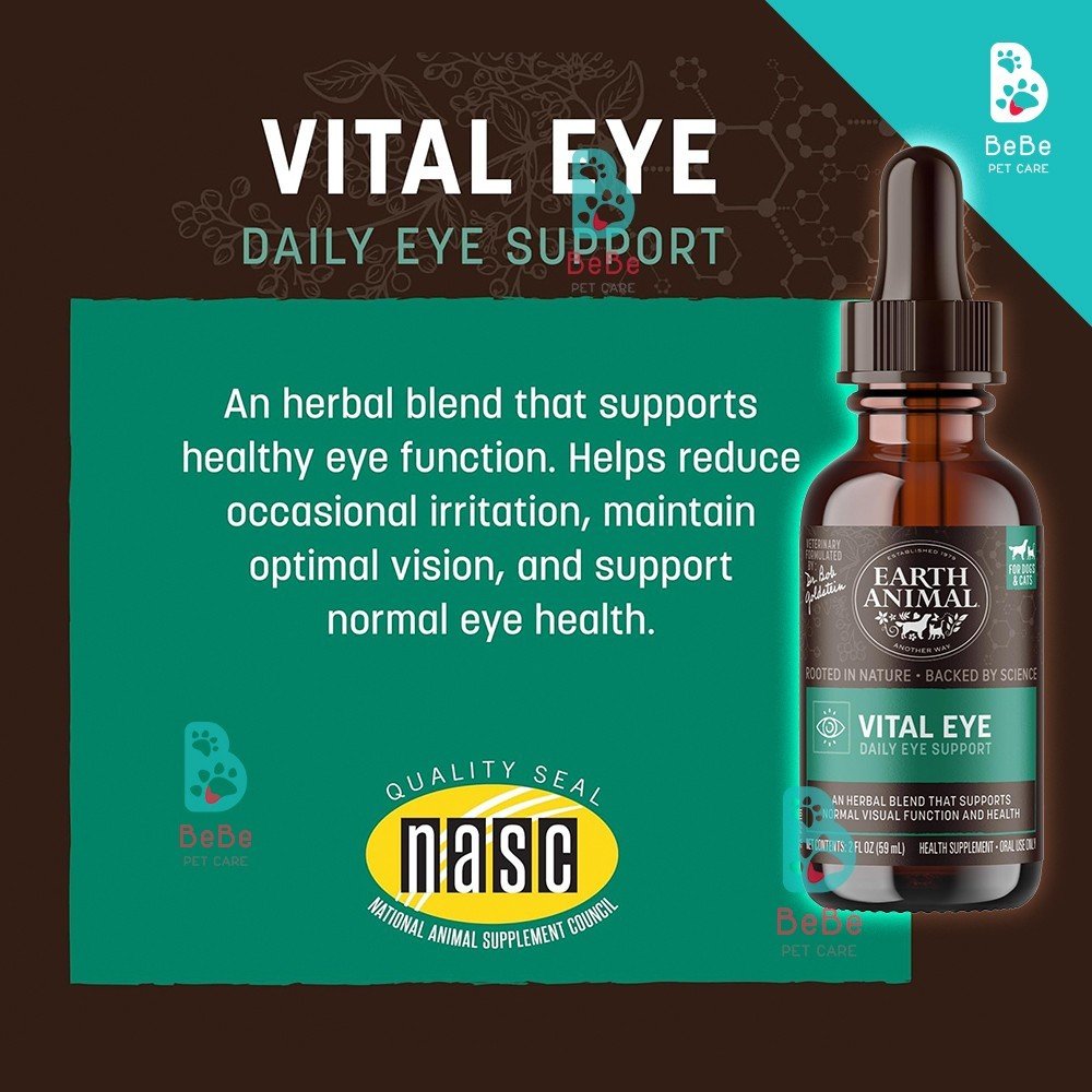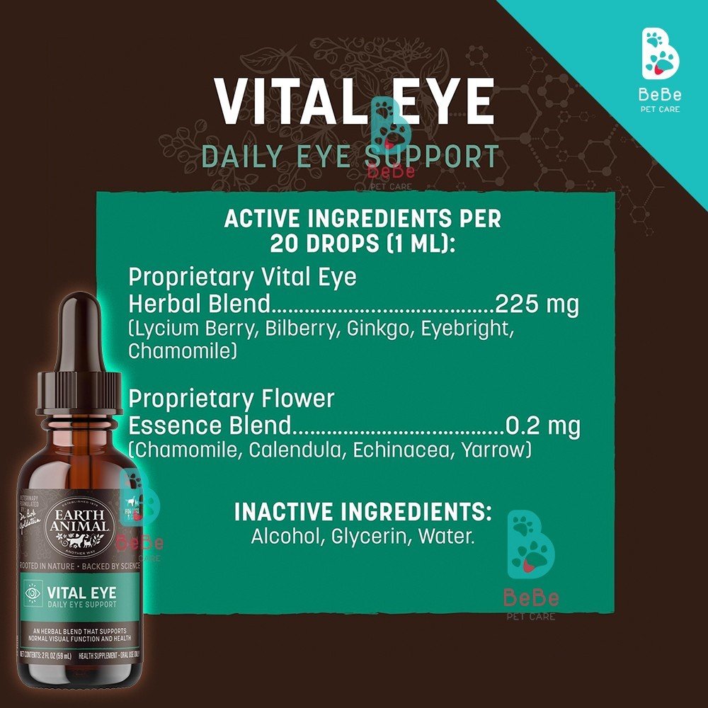 Earth Animal Vital Eye là hỗn hợp thảo dược hữu cơ hỗ trợ chức năng mắt khỏe mạnh, đồng thời giúp làm dịu kích ứng, duy trì thị lực tối ưu và hỗ trợ sức khỏe của mắt. Công thức tự nhiên bao gồm các loại thảo mộc được trồng hữu cơ như eyebright, hoa cúc, bạch quả, lyceum và bayberry. Chiết xuất tự nhiên và rất dễ sử dụng