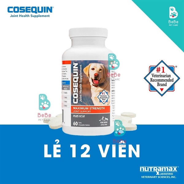 Thương hiệu số 1 được bác sĩ thú y Mỹ khuyên dùng để hổ trợ sức khỏe sụn và xương khớp của chó mèo- Khôi phục khả năng vận động và chất lượng sụn khớp, hông tổng thể của thú cưng để giúp chúng chạy, nhảy và leo cầu thang mà không bị đau hoặc khó chịu hơn.- Có sự kết hợp độc quyền của glucosamine có độ tinh khiết cao, chondroitin sulfate trọng lượng phân tử thấp và mangan ascorbate, cũng như MSM và HA để tăng thêm hiệu quả.- Cosequin là chất bổ sung glucosamine / chondroitin sulfate duy nhất đã được chứng minh là an toàn, hiệu quả và khả dụng sinh học trong các nghiên cứu thú y tại Hoa Kỳ đã được kiểm duyệt, sản xuất và kiểm soát.- Sản phẩm bổ sung dinh dưỡng được nghiên cứu khoa học, được cấp bằng sáng chế giúp chó mèo duy trì các khớp và sụn chắc khỏe.- Được sản xuất tại Hoa Kỳ theo cùng một tiêu chuẩn sản xuất nghiêm ngặt được áp dụng bởi ngành công nghiệp dược phẩm;HDSD:- Dành Cho Chó: + Dưới 7kg: ½ viên/ngày + Từ 7kg tới 15kg: 1 viên/ngày + Từ 15kg tới 30kg: 2 viên/ngày + Trên 30kg: 3 viên/ngày- Dành Cho Mèo: + Dưới 5kg: 1 viên/ngày + Trên 5kg: 2 viên/ngày